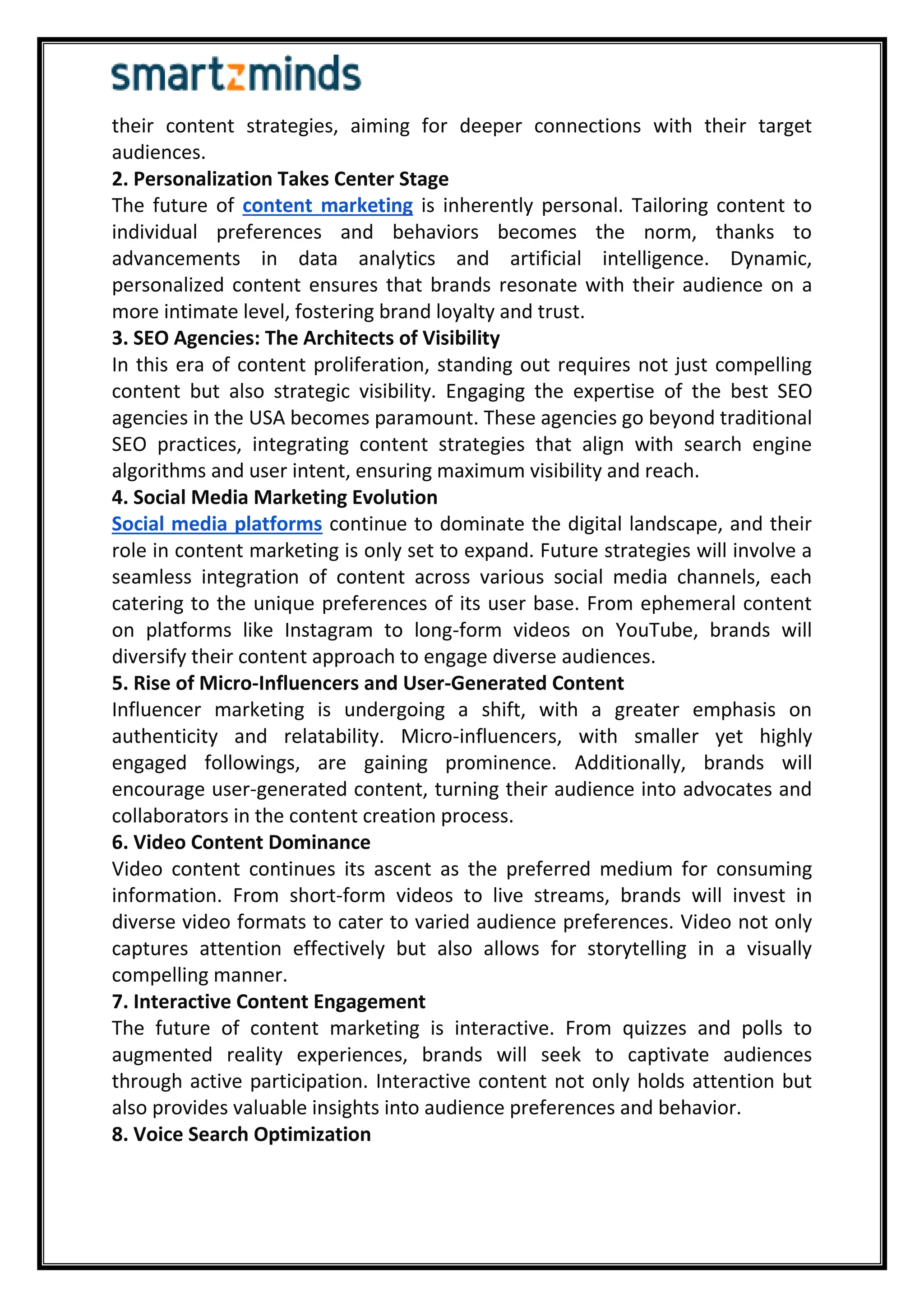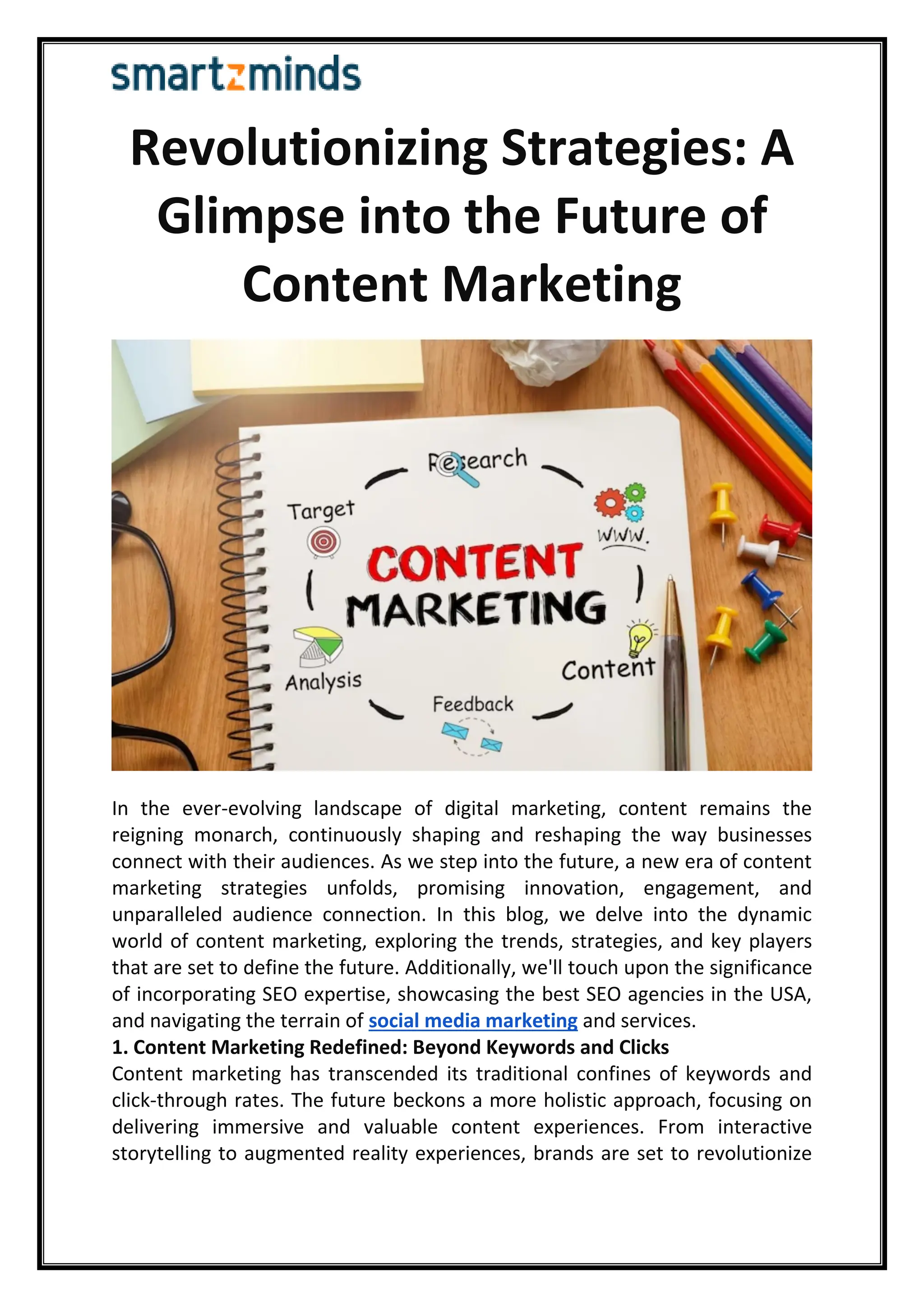 The document discusses the evolving landscape of content marketing, highlighting the shift towards immersive, personalized, and data-driven strategies. Key trends include the rise of video content, micro-influencers, interactive experiences, and the importance of SEO agencies for visibility. Brands are encouraged to embrace these innovations to build deeper connections and engage more effectively with their audiences.