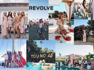The document provides a social media audit and strategy for Revolve Clothing for 2018. It analyzes Revolve's current social media presence, including follower counts, engagement rates, and traffic sources. The objectives are to increase Instagram followers by 20%, boost engagement on Twitter, and drive more traffic to the website. The strategy includes influencer partnerships, monthly themed events, and diversifying content. Key roles and a critical response plan are also outlined.