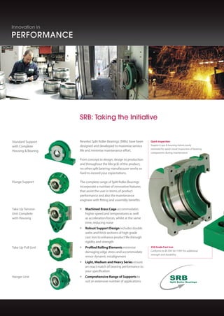 Revolvo's innovative split roller bearing technology provides a compact, interchangeable solution for standard plummer blocks, enabling easier installation and maintenance. The design accommodates high degrees of shaft misalignment, allows for rapid inspection, and offers a variety of bespoke applications. Revolvo emphasizes customer support and continuous improvement to enhance plant efficiency and reduce downtime across multiple industries.