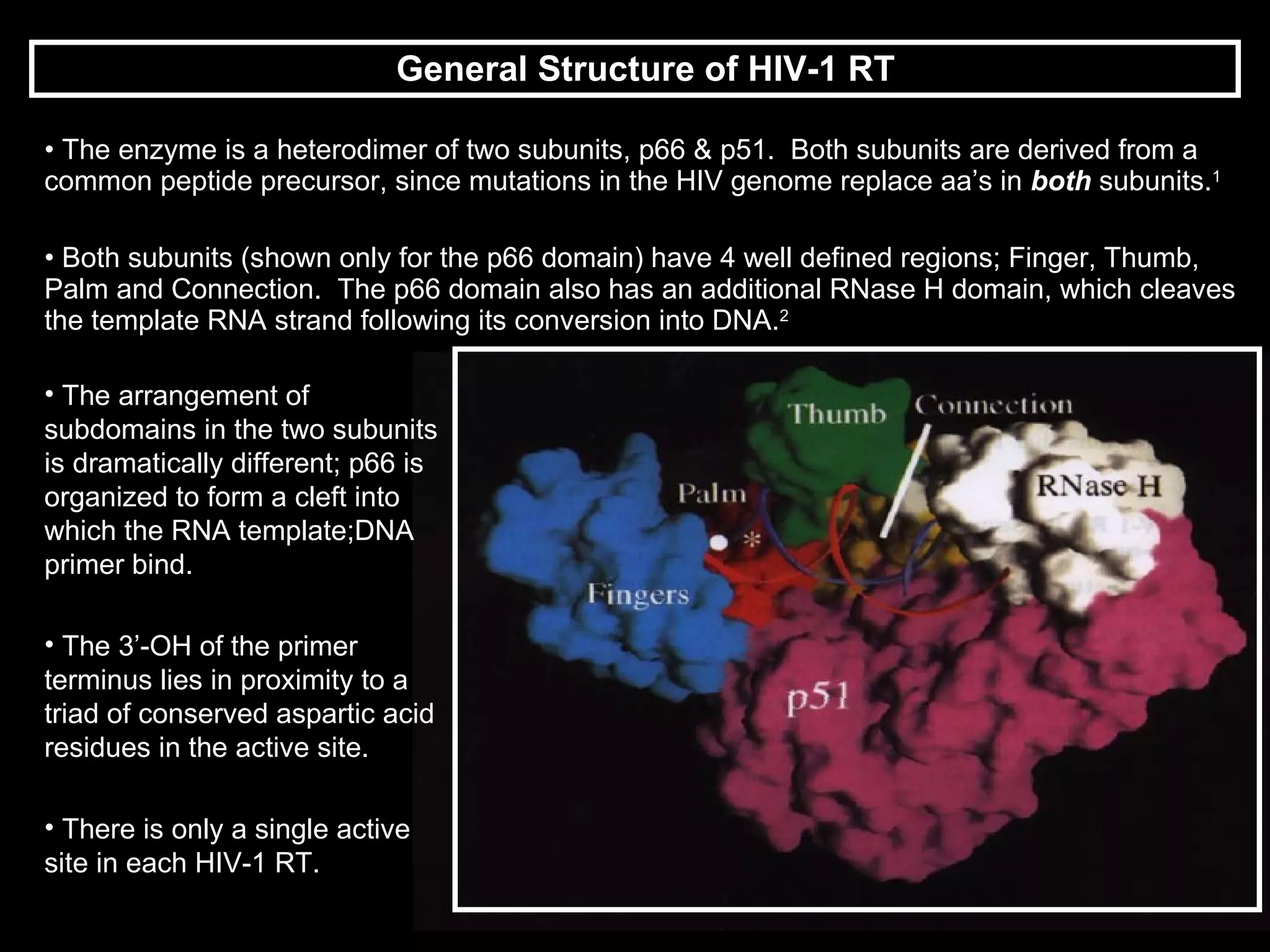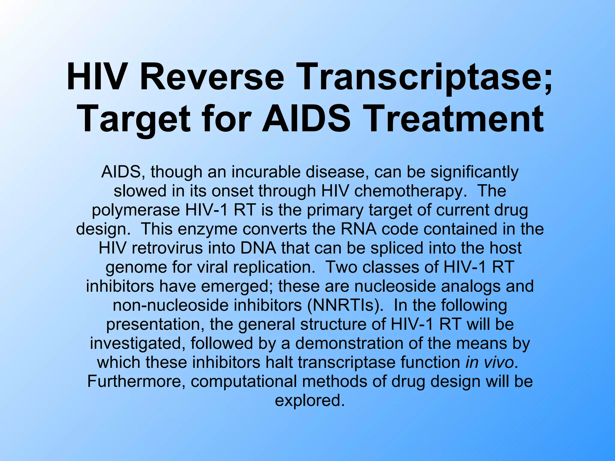 HIV reverse transcriptase is the primary target of AIDS drugs. It converts HIV's RNA code into DNA for viral replication. There are two classes of inhibitors: nucleoside analogs and non-nucleoside inhibitors (NNRTIs). NNRTIs bind to a site near the active site and prevent conformational changes needed for viral replication. Using composite binding sites from multiple structures allows rational drug design of new NNRTIs with higher inhibitory activity and lower toxicity than previous methods.