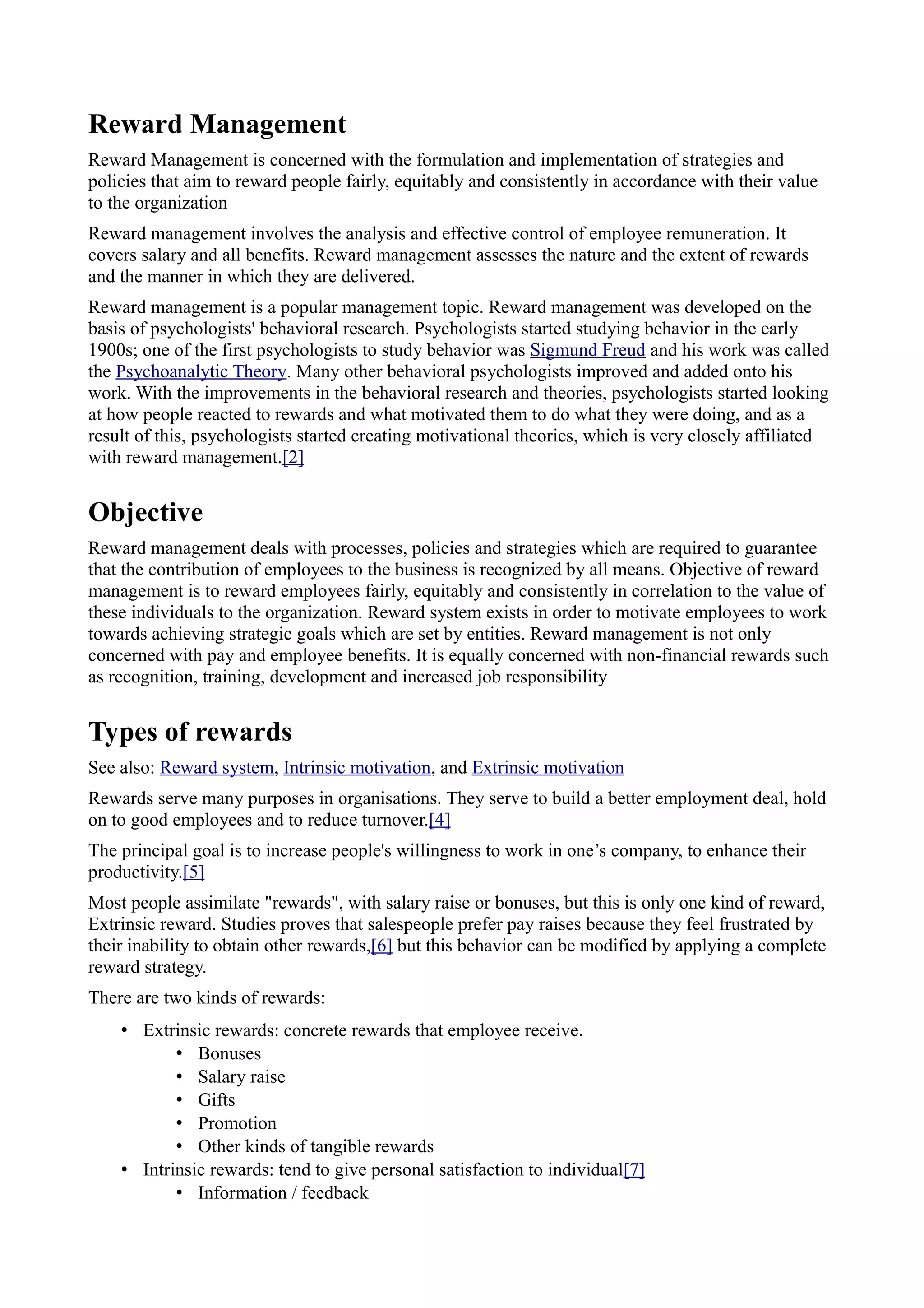 Reward management aims to reward employees fairly based on their value and contributions. It involves analyzing compensation strategies to ensure pay and benefits are equitable. Reward management considers both financial rewards like pay raises as well as non-financial rewards like recognition or increased responsibilities. The goal is to motivate employees and link rewards to business goals and strategies. There are two main types of rewards - intrinsic rewards that provide personal satisfaction, and extrinsic rewards like bonuses that are meant to incentivize performance and productivity. An effective reward system supports business objectives, recruits and retains talent, and motivates employees while complying with legal standards.