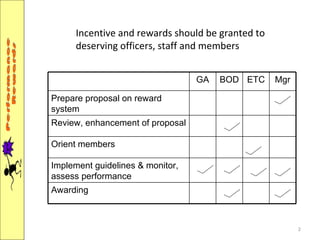 The document proposes a reward system for deserving officers, staff, and members of an organization. It lists suggested awards for achievements like recruiting, loan and dues payments, savings, projects funded, and employee performance. It also outlines tax-exempt benefits such as medical allowances, rice subsidies, uniforms, gifts, and achievement awards. The conclusion recommends rewarding team members through recognition, notes, promotions rather than solely money to motivate better performance.