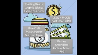 This document summarizes and analyzes the rewards for several crowdfunding projects on Kickstarter. It discusses the rewards for a science fiction comics magazine, moon calendar, matcha tea, and role-playing video game. For the comics and calendar projects, it notes that simply increasing quantities of the same reward for higher tiers lacks appeal. The matcha tea rewards are found to have better value as consumable rewards that buyers want to continue purchasing. The video game rewards are praised for their uniqueness at higher tiers, which could make the increased costs worthwhile for interested backers.
