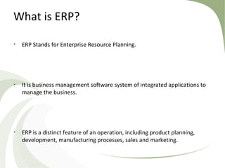 This document provides an overview and description of the REX ERP application. It describes what ERP is, the significance of ERP in today's competition, key features of the REX ERP application, modules and business scenarios the application supports, and how to get started with the application. The application is a cloud-based ERP solution that allows for integrated management of business processes including accounting, inventory, sales, and reporting. It provides functionality for accounts payable, accounts receivable, general ledger, treasury management and robust reporting capabilities.