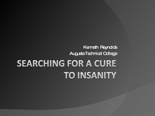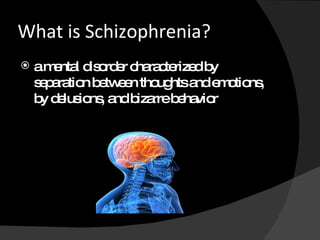 Schizophrenia is a mental disorder characterized by delusions, hallucinations, and disordered thinking and behavior. It is caused by genetic and biological factors, not stress or depression. Symptoms include confusion, changes in eating/sleeping, withdrawal, and strange behavior. Treatment involves medications, therapy, and sometimes hospitalization. Finding a cure would help thousands of sufferers and could be highly profitable. It would be administered through treatment facilities and medical care. Funding research for a cure would benefit patients and society by controlling symptoms before they become dangerous.