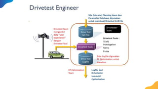 Drive test adalah metode pengukuran kualitas sinyal dalam jaringan seluler yang melibatkan dua jenis pengujian, yaitu drive test (outdoor) dan walk test (indoor). Tujuan dari drive test mencakup pengumpulan data kinerja jaringan, verifikasi kualitas sinyal, dan analisis masalah yang terkait dengan cakupan dan kegagalan panggilan. Peralatan yang digunakan meliputi laptop, smartphone, GPS, dan perangkat lunak analisis untuk memastikan optimalisasi jaringan berdasarkan kondisi nyata di lapangan.