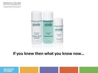 This document summarizes skincare products and business opportunities from Rodan + Fields, a dermatologist-created skincare company. It describes several skincare regimens for anti-aging, acne-prone skin, sensitive skin, and skin lightening. It also outlines a direct sales business model for selling Rodan + Fields products, highlighting opportunities to earn income through building a customer base and referral network. The goal is to change skin and change lives through clinically-proven skincare solutions and a turnkey direct sales business model.