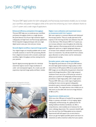 The document describes the Philips Juno DRF digital radiography and fluoroscopy system. It highlights that the 2-in-1 system allows for increased efficiency and patient throughput by performing both radiography and fluoroscopy with one detector. This also maximizes room utilization. The system provides high quality images for a wide range of applications while simplifying the digital workflow.