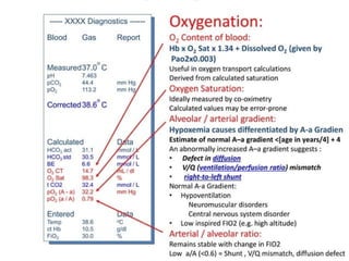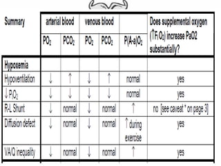 The document provides an extensive overview of acute respiratory failure, including its definition, classification into hypoxemic and hypercapnic types, and underlying causes such as hypoventilation and ventilation-perfusion mismatch. It also outlines clinical manifestations, diagnostic methods, and treatment options for the different types of respiratory failure. Key clinical features include dyspnea, confusion, and tachypnea, with management strategies ranging from addressing underlying conditions to mechanical ventilation when necessary.