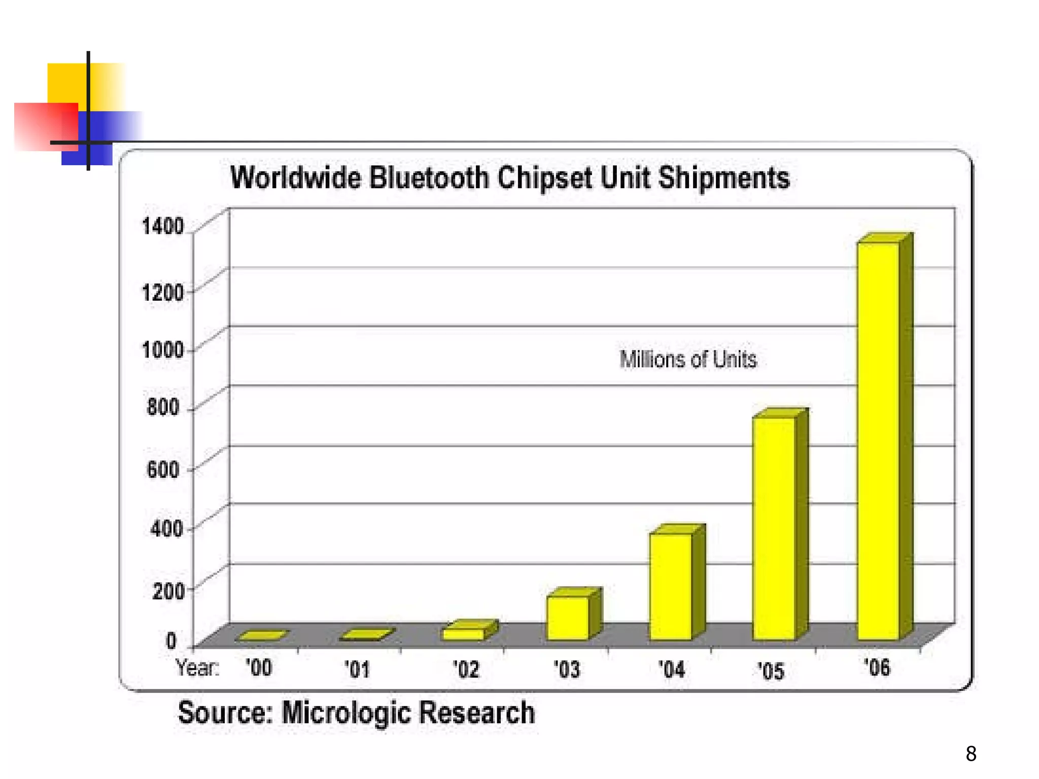 Overview of Bluetooth2.4GHz - 2.48 GHz ISM band. GFSK modulation: index = 0.28 - 0.35. 1 Mb/s data rate and 1 MHz channel spacing. The market size for Bluetooth chip to be $4.3 billion by 2005 (Merrill Lynch) The Bluetooth special interest group has signed up 2491 member companies
