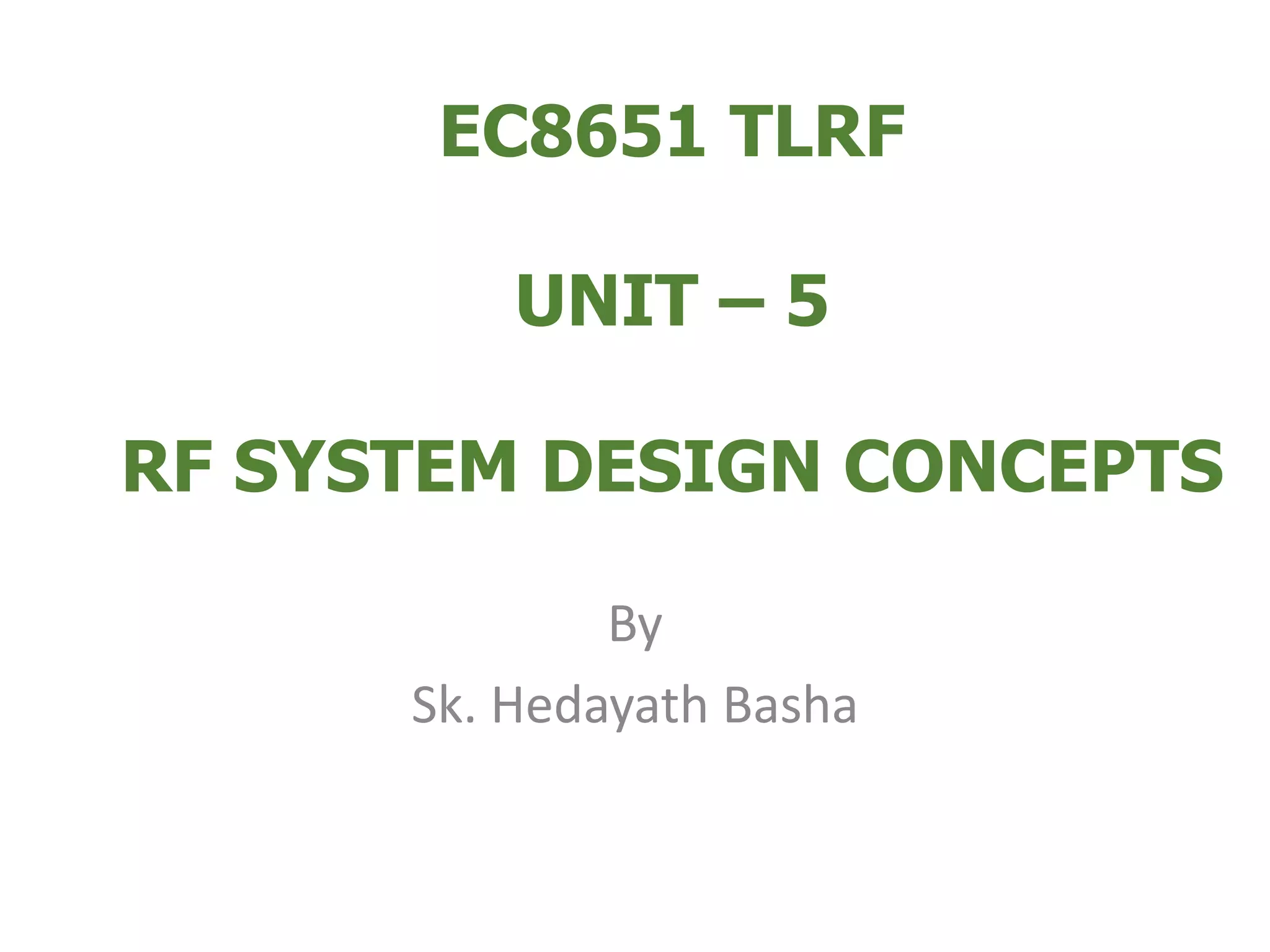 This document discusses concepts in RF system design, including active RF components like transistors and basic RF concepts. It covers the frequency range of RF, semiconductor materials used in RF like GaN, GaAs, and SiGe. Specific RF devices discussed include Schottky diodes, which are used in RF detectors, mixers, oscillators and amplifiers due to their smaller junction capacitance. Bipolar junction transistors (BJTs) and field effect transistors (FETs) are also covered, noting that BJTs are widely used in RF applications due to their low cost, operating frequency, low noise performance and high power handling capacity through specialized construction designs.