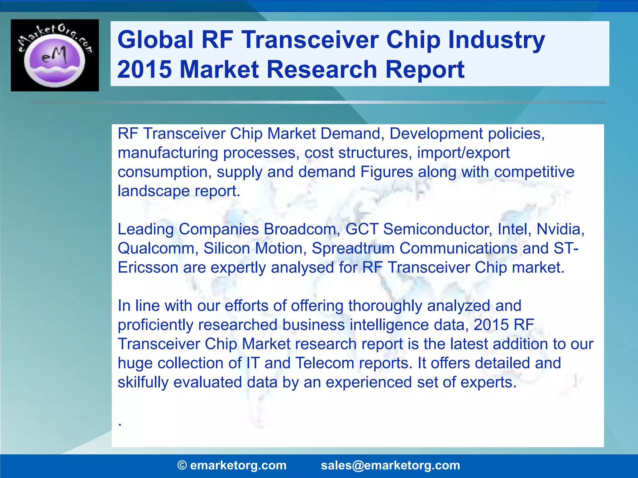 The 2015 Global RF Transceiver Chip Industry Market Research Report provides an in-depth analysis of the market including demand, development policies, manufacturing processes, and competitive landscape, covering key players like Broadcom, Intel, and Qualcomm. The report features detailed data on production, import/export consumption, and market trends across global regions, supported by comprehensive statistics and forecasts. It aims to assist new entrants and existing companies in making informed investment decisions within the RF transceiver chip sector.