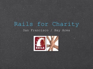This document outlines a meeting for Rails for Charity, an organization that builds open source web applications to help improve society. The agenda includes introducing members, discussing the mission to create technology for social good, identifying areas for contribution like healthcare and education, and benefits like resume building. Members will pitch ideas and form teams to iteratively develop working versions, with tools like GitHub, Pivotal Tracker, Travis CI, and Heroku. Diverse skills are welcomed to collaborate on challenging problems with a direct social impact.