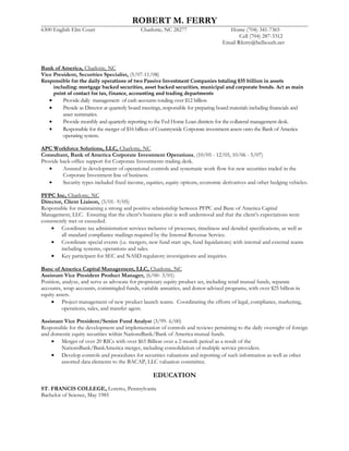 Robert Ferry has over 25 years of experience in investment management and back office operations. He has held roles managing large client relationships, developing products, and overseeing mutual fund accounting and valuations. His most recent experience includes providing back office support and trade reconciliation for Ally Bank.