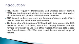 RFID (Radio Frequency Identification) and WSN (Wireless Sensor Networks) are crucial wireless technologies with various applications, such as object tracking and environmental monitoring. The integration of RFID with WSN enhances reading range and capabilities, with passive and active tags aiding in diverse industries like automotive and pharmaceuticals. The future of these technologies is promising, emphasizing improvements in sensing, transmission, networking, and security.