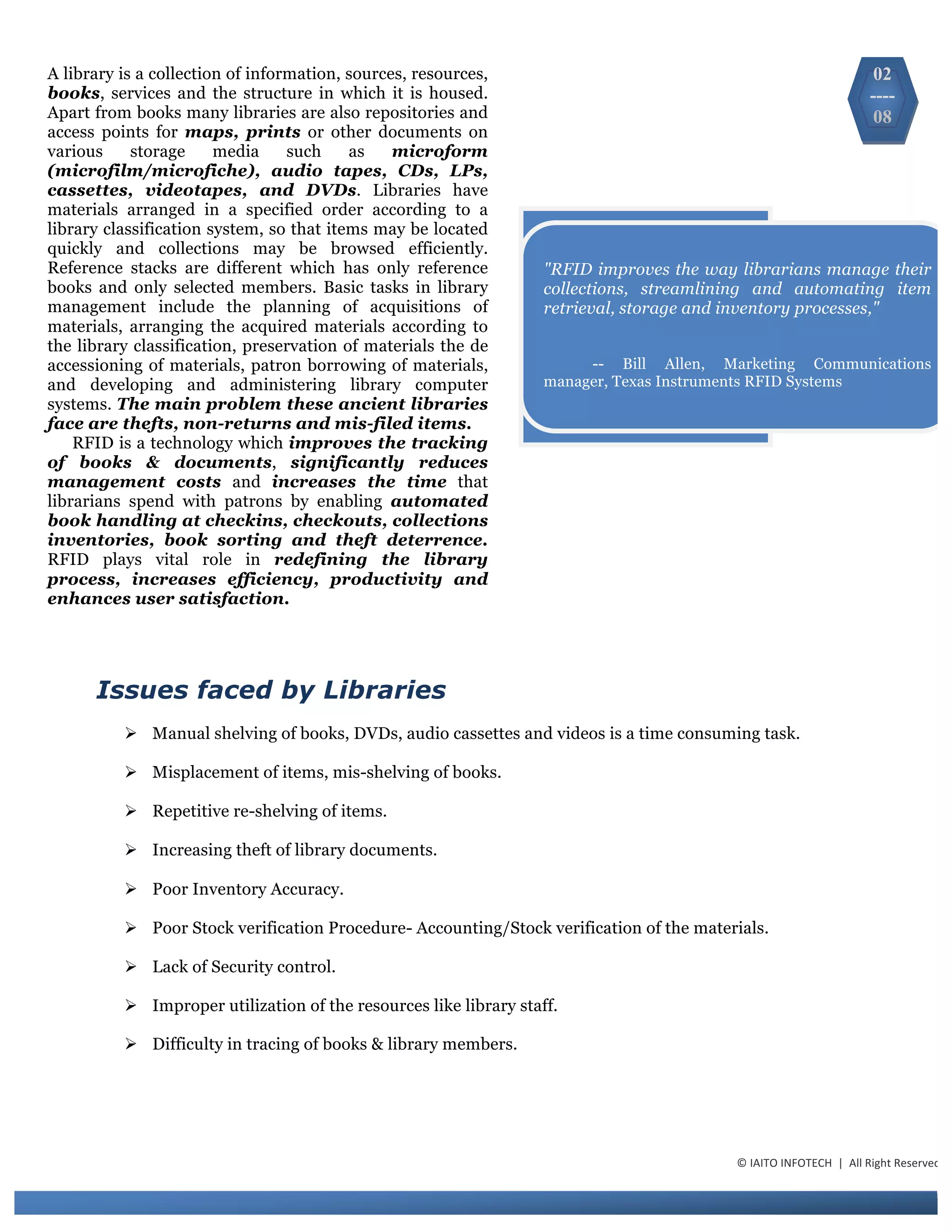The document discusses the implementation of RFID technology in library management systems to address issues such as item misplacement, theft, and inefficient inventory processes. RFID enhances the tracking of materials, automates check-in/check-out processes, improves efficiency, and increases user satisfaction. Iaito Infotech offers tailored RFID solutions, focusing on ROI and ease of use for libraries.