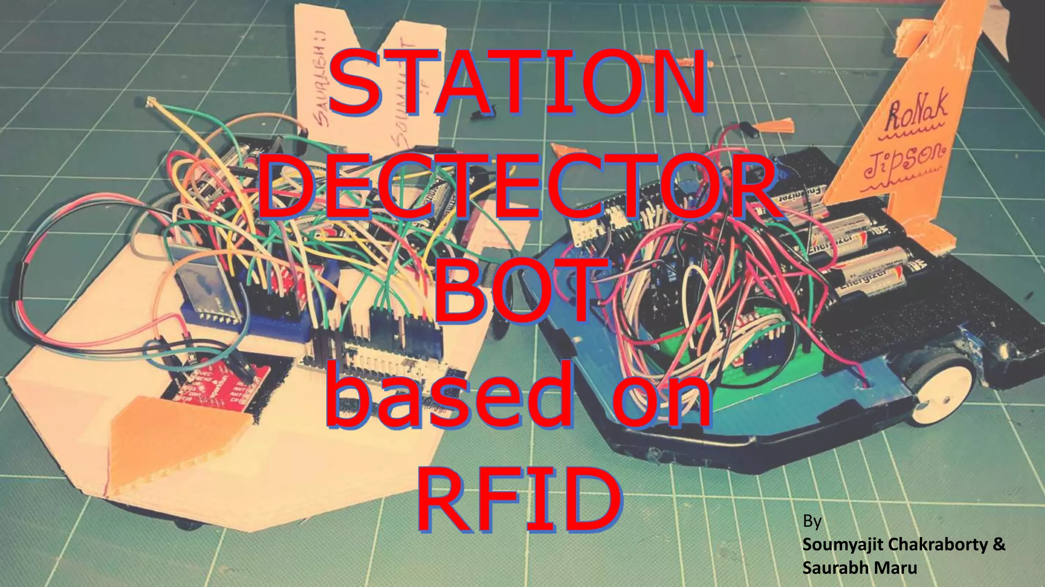 The document outlines the creation of a land robot controlled via Bluetooth using an Arduino microcontroller, which can be maneuvered through touch buttons or by tilting an Android phone. It details the components used, including DC motors, an RFID reader for station detection, and the assembly process of the robot's structure from corrugated plastic. The document also highlights the technical specifications of the Arduino board and motor driver used in the project.