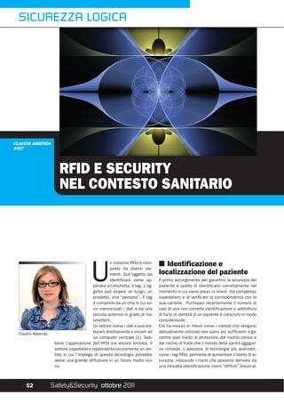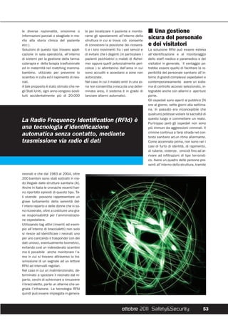 Il documento discute l'uso della tecnologia RFID nel settore sanitario per migliorare la sicurezza dei pazienti, prevenire furti di identità e rapimenti. Sottolinea l'importanza di un'identificazione corretta e il monitoraggio dei movimenti all'interno delle strutture ospedaliere, con applicazioni specifiche per neonati e accessi riservati. L'adozione di RFID potrebbe ridurre i rischi associati a identificazioni errate e aumentare la protezione contro crimini sanitari.