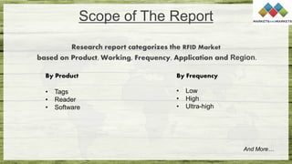 The global RFID market was valued at $10.7 billion in 2021 and is projected to reach $17.4 billion by 2026, growing at a CAGR of 10.2% during the forecast period. The market is segmented by product, frequency, application, and region. Key players in the market include Avery Dennison, Zebra Technologies, Honeywell, NXP Semiconductors, and Impinj. The tag segment is expected to register the highest growth rate during the forecast period. North America currently holds the largest share of the RFID market.