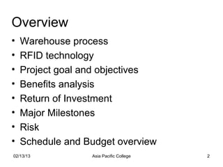 The document proposes developing a warehouse management system using RFID technology. Key benefits would include automating manual processes, reducing labor costs and errors, and improving tracking of inventory. The project aims to increase efficiency, lower costs, and provide faster access to information. Risks include ensuring proper implementation of the RFID devices that the system relies on for data. The project timeline, budget, and milestones are also outlined.