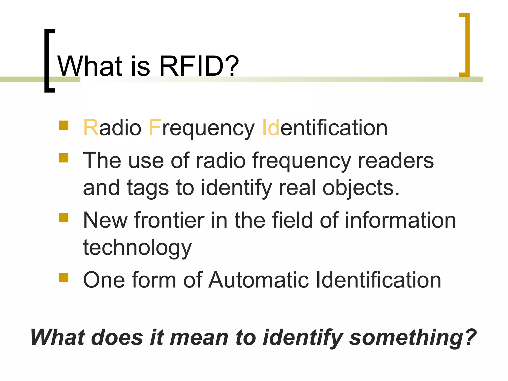 RFID (radio frequency identification) allows objects to be identified using radio waves transmitted from tags attached to objects. RFID systems consist of tags, readers, and an antenna. Tags can be passive (powered by reader), active (internal battery), or semi-passive (battery assisted). Common applications include supply chain management, livestock tagging, toll payment, and electronic passports. While RFID provides advantages like wireless data transfer and ability to work in harsh environments, concerns around privacy, security, and lack of standards remain open challenges.