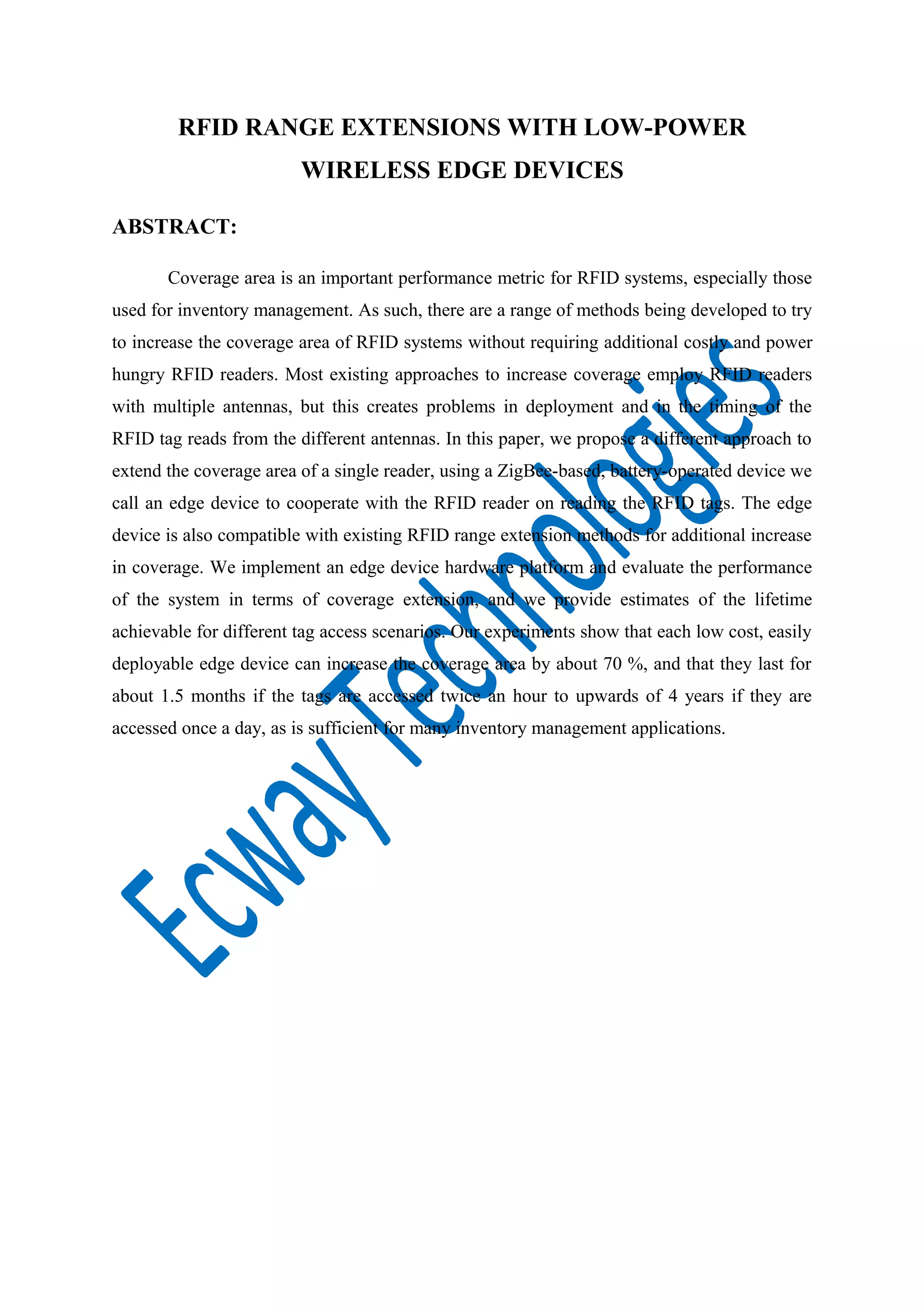 This document proposes using low-power wireless edge devices to extend the coverage area of a single RFID reader without requiring additional costly readers. The edge devices cooperate with the RFID reader using ZigBee to read RFID tags from an increased area. Experiments showed each edge device could increase the coverage area by about 70% while lasting from 1.5 months to over 4 years depending on how often tags were accessed.