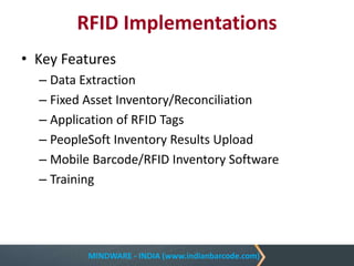 The document outlines RFID implementations by Mindware India, highlighting features such as data extraction, asset tagging, and mobile inventory management. It discusses the benefits of RFID in enhancing inventory strategies, reducing physical contact with assets, and simplifying the reconciliation process. The document also addresses considerations for tag environments and types, emphasizing the importance of asset management through RFID technology.