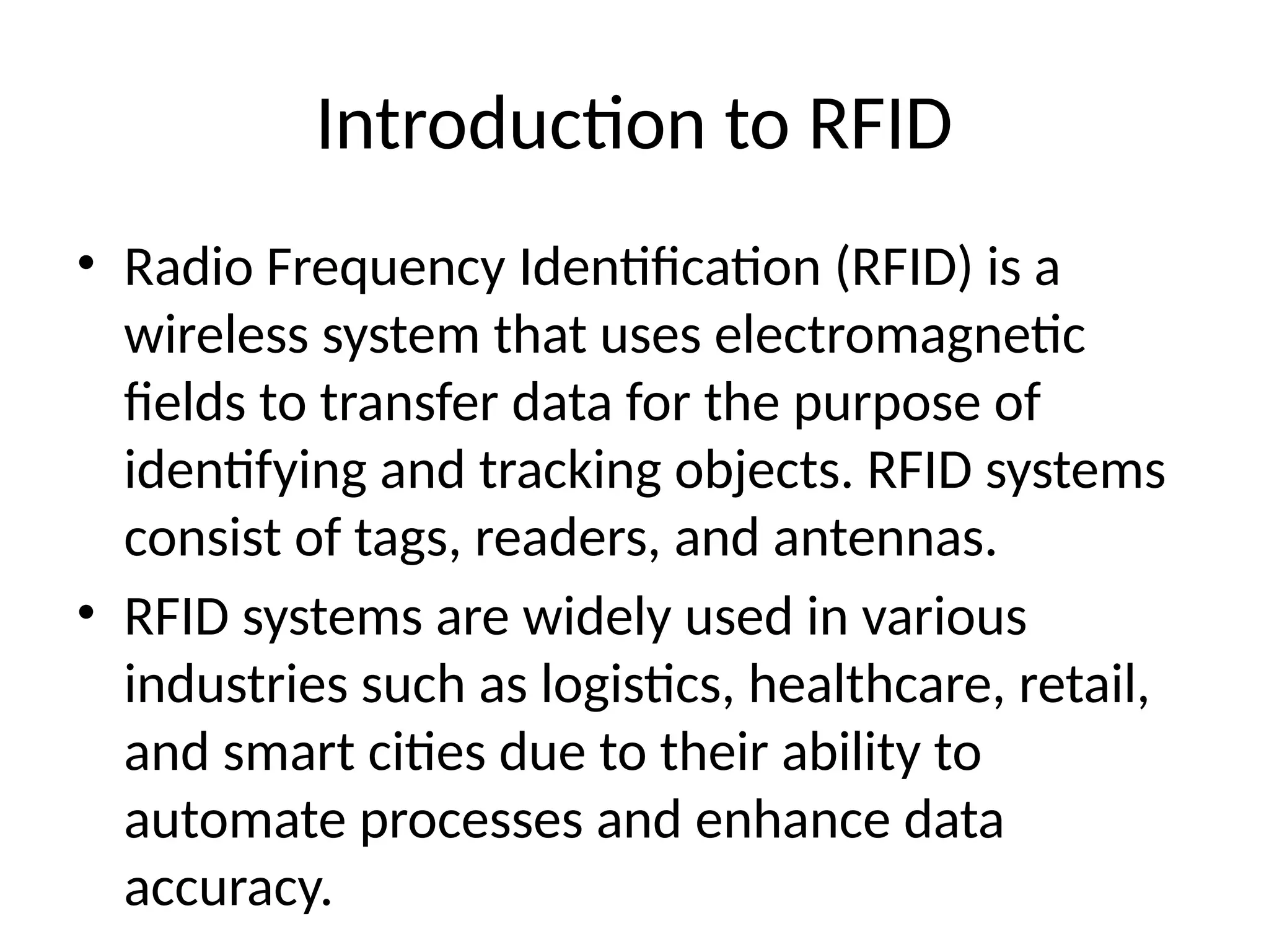 RFID (Radio Frequency Identification) is a wireless technology used for identifying and tracking objects through electromagnetic fields, composed of tags, readers, and antennas. It is applied in various industries for automation and data accuracy, utilizing different types of tags (passive, active, semi-passive) and operational frequencies (LF, HF, UHF, microwave). The communication process involves a reader sending a signal to a tag, which responds with its data, and various protocols guide the interaction between tags and readers.