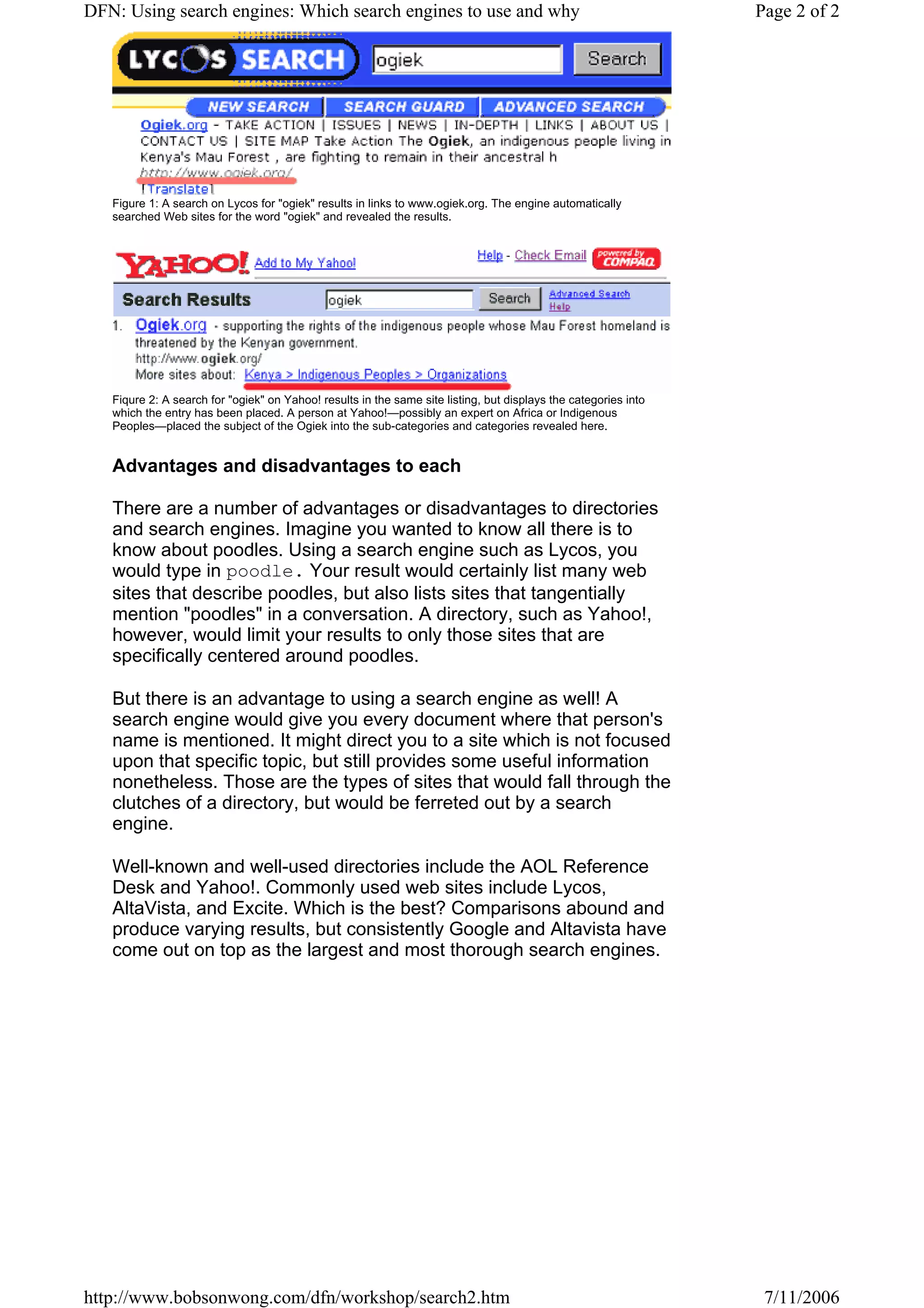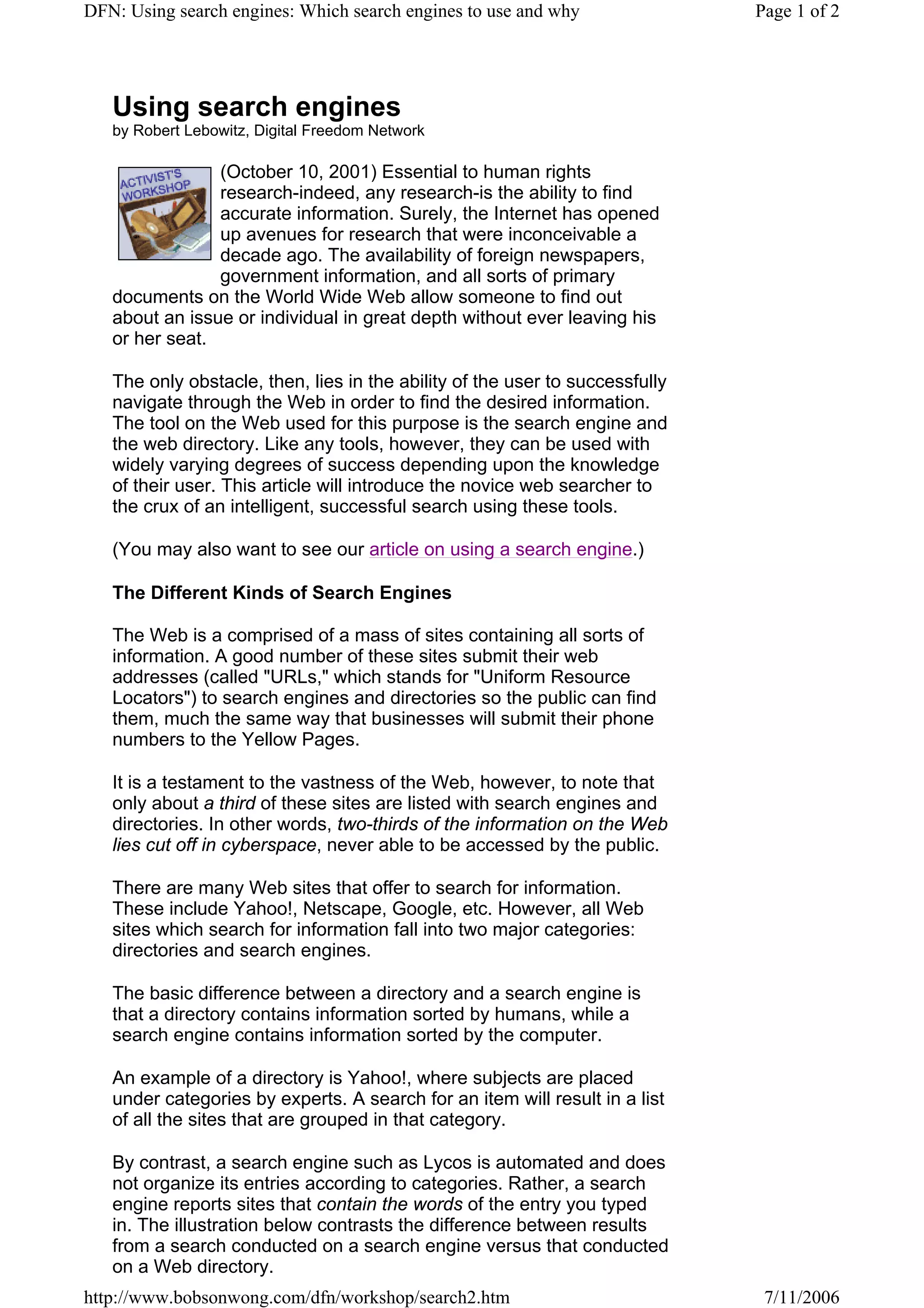 There are two main types of tools that can be used to search the web - directories and search engines. Directories contain information sorted by humans into categories, while search engines contain information sorted by computers. Directories like Yahoo provide a list of sites grouped by category, while search engines like Lycos report sites containing the search terms. Directories are better for finding sites focused on a specific topic, while search engines may also return tangentially related sites but ensure all mentions of the search terms are returned. Commonly used directories include Yahoo and AOL Reference Desk, while search engines like Google, AltaVista and Lycos are widely used and consistently rate as the most thorough.