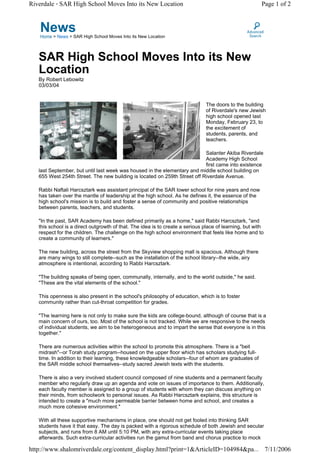 The Salanter Akiba Riverdale Academy High School recently moved into its new building, excitedly welcoming students, parents, and teachers. Rabbi Naftali Harcsztark, the new principal, aims to build a strong sense of community and positive relationships. The spacious new building is intended to feel open and welcoming internally and to the outside world. The school philosophy emphasizes community over competition, with all students learning together in a supportive environment.