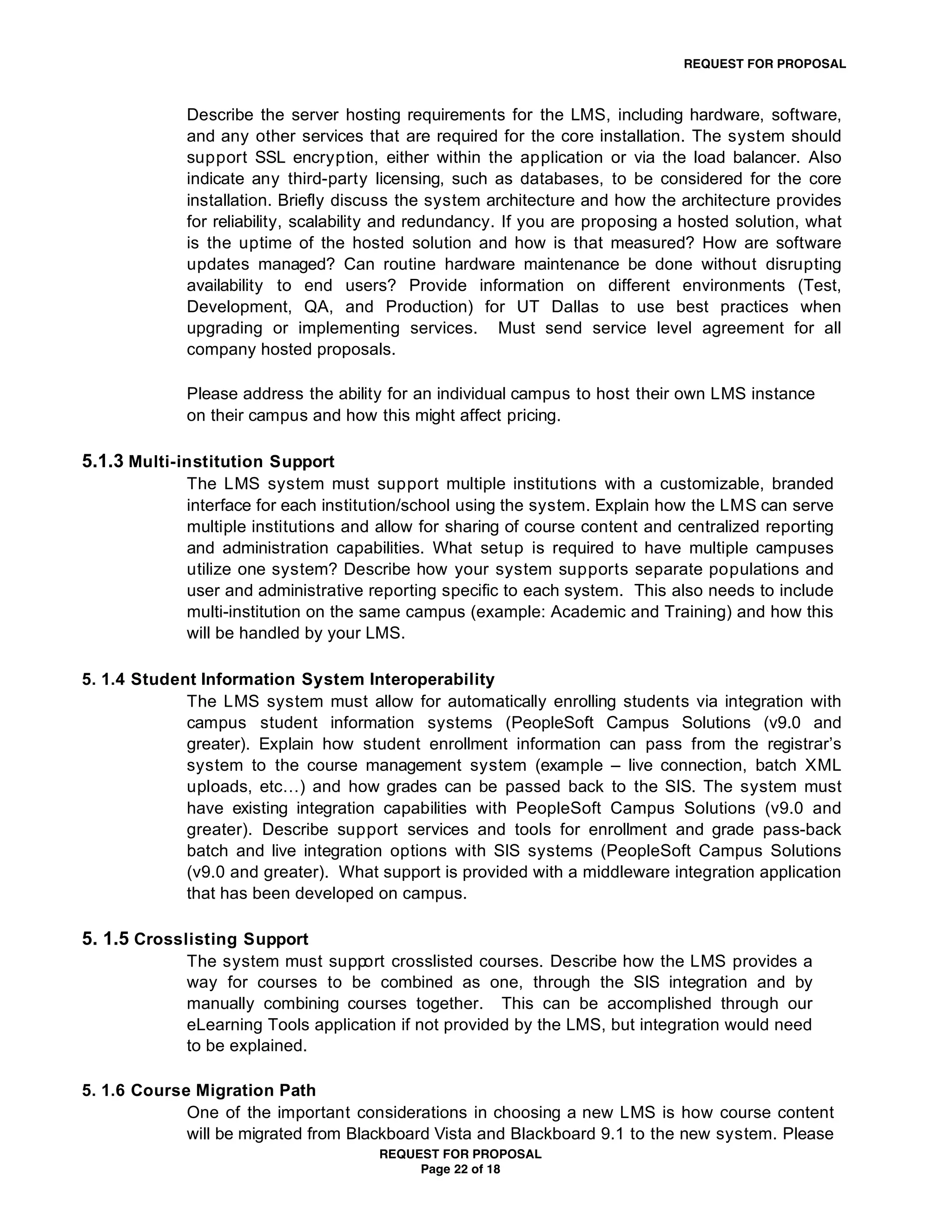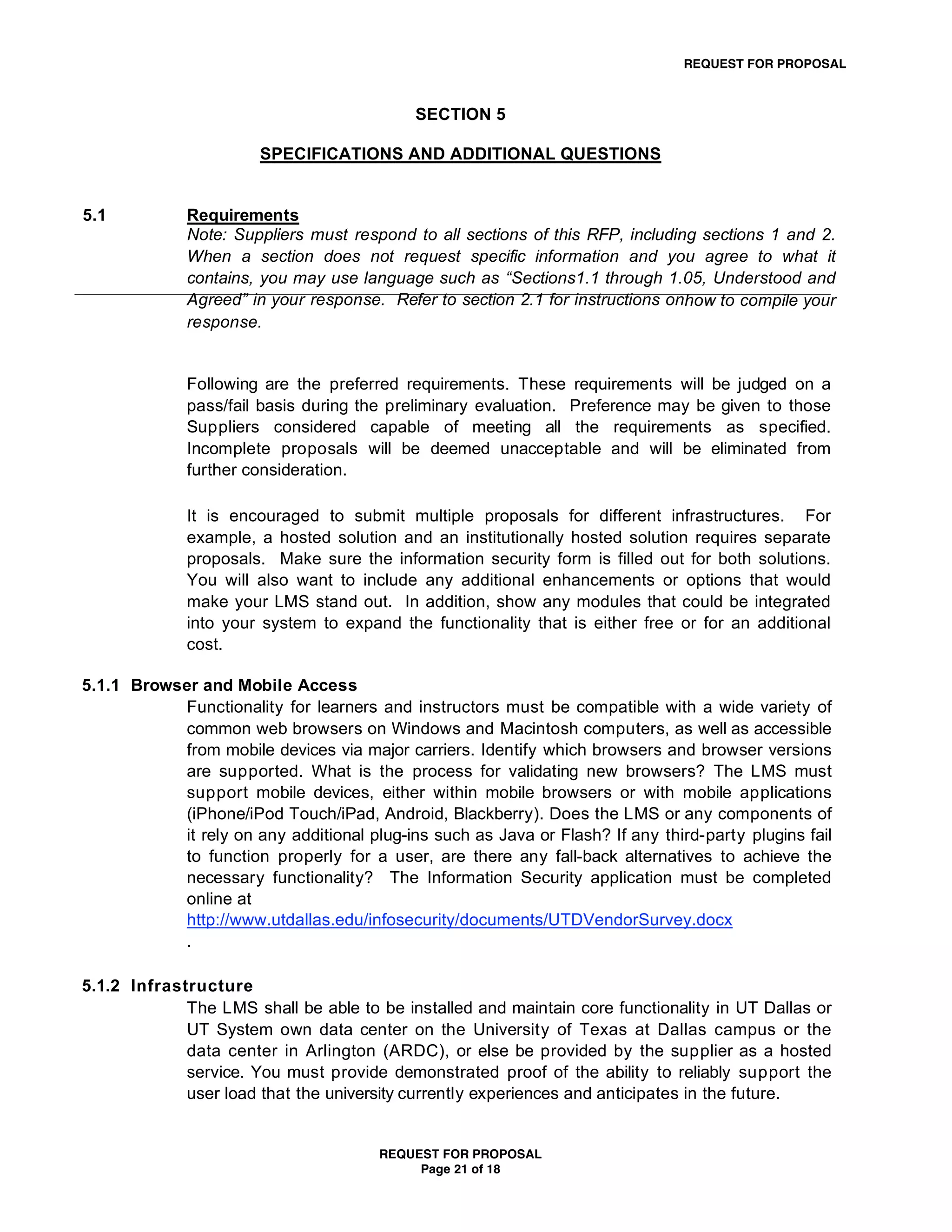 This document is a Request for Proposal (RFP) from the University of Texas at Dallas seeking a new Learning Management System (LMS). It provides specifications and requirements for the LMS, including browser and mobile access, infrastructure requirements, multi-institution support, student information system integration, course migration, third party integrations, APIs, multimedia workflow, support services, sandbox environment, ease of use, accessibility, notifications, and cost proposals. Suppliers are asked to provide details about their company, market strategy, software enhancements, and vision for the future to demonstrate their viability and commitment to higher education. Responses will be evaluated based on the requirements in the RFP.