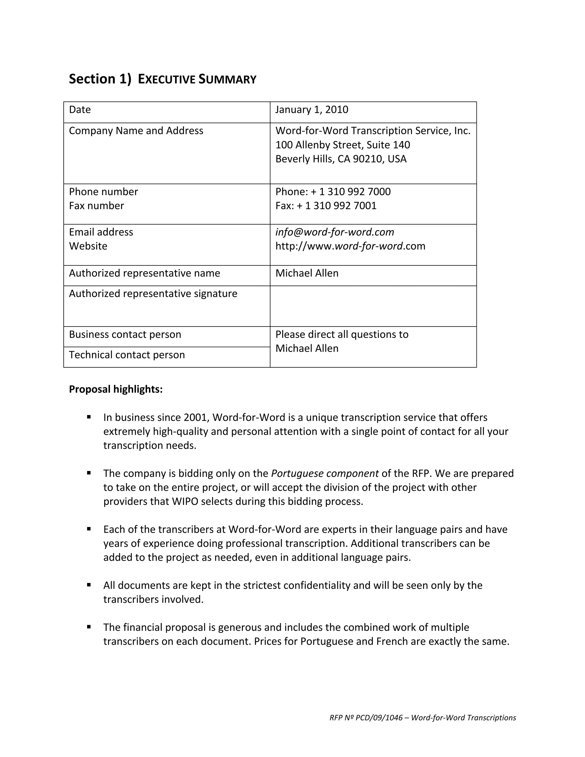 This document provides an executive summary and proposal from Word-for-Word Transcription Service for transcription services. It outlines the company's background and experience since 2001, including that transcription is done by a small group of expert linguists. It also provides references from past clients like Creative Transcriptions and the law firm Dunn & Martin LLP who were satisfied with the company's accurate and timely transcription work. The proposal highlights competitive pricing and the ability to take on the entire proposed project or portions of it.