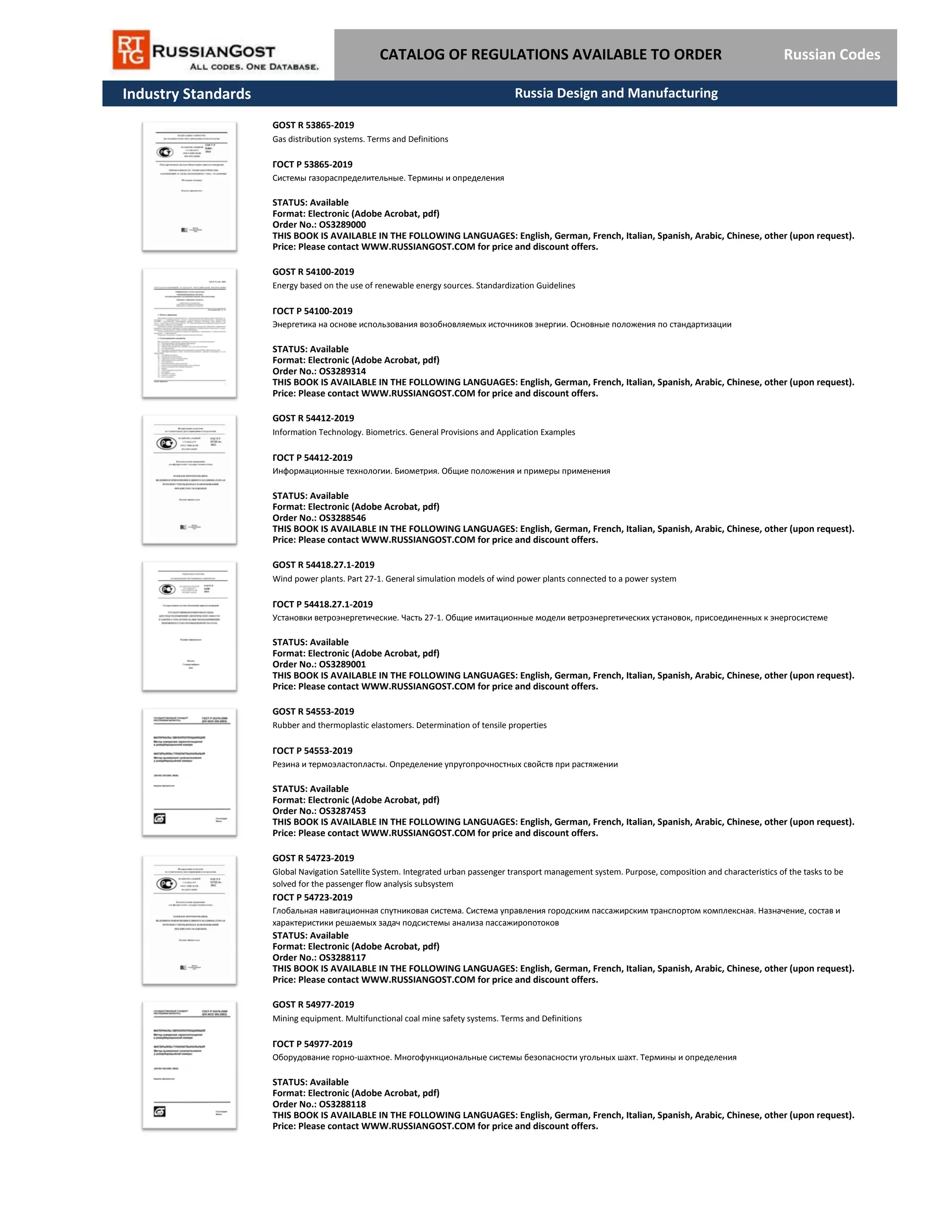 The document provides a catalog of Russian industry standards related to various fields including mining equipment, rubber properties, satellite systems, biometrics, wind power plants, and renewable energy, all available in multiple languages. Each standard is accessible in electronic format, with specific order numbers and pricing details available upon contacting the website. It emphasizes the availability of these publications for the design and manufacturing sectors in Russia.