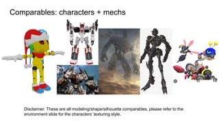 This document provides style guidelines and references for the RG4 project. It includes character and environment comparables to establish the modeling and texturing style. It then lists the player character, 4 enemy NPCs, and various environment areas like the hand, forearm, elbow, and upper arm. It also includes a color guide, details the production pipeline and team roles, and outlines the file naming conventions using categories and sub-parts.