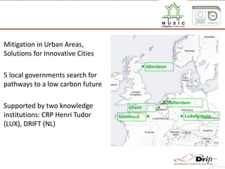 Five European cities - Aberdeen, Ghent, Ludwigsburg, Montreuil, and Rotterdam - participated in a transition management process to develop pathways towards a low carbon future. The process involved understanding each city's current system through interviews, convening transition arenas of diverse change agents to develop long-term visions and agendas, and supporting over 30 transition projects. The arenas empowered participants, improved understanding of sustainability challenges, and sparked new networks and innovations. Key lessons included tapping into existing city dynamics, allowing sufficient time, and elevating knowledge among all involved to better guide transitions towards sustainable cities.