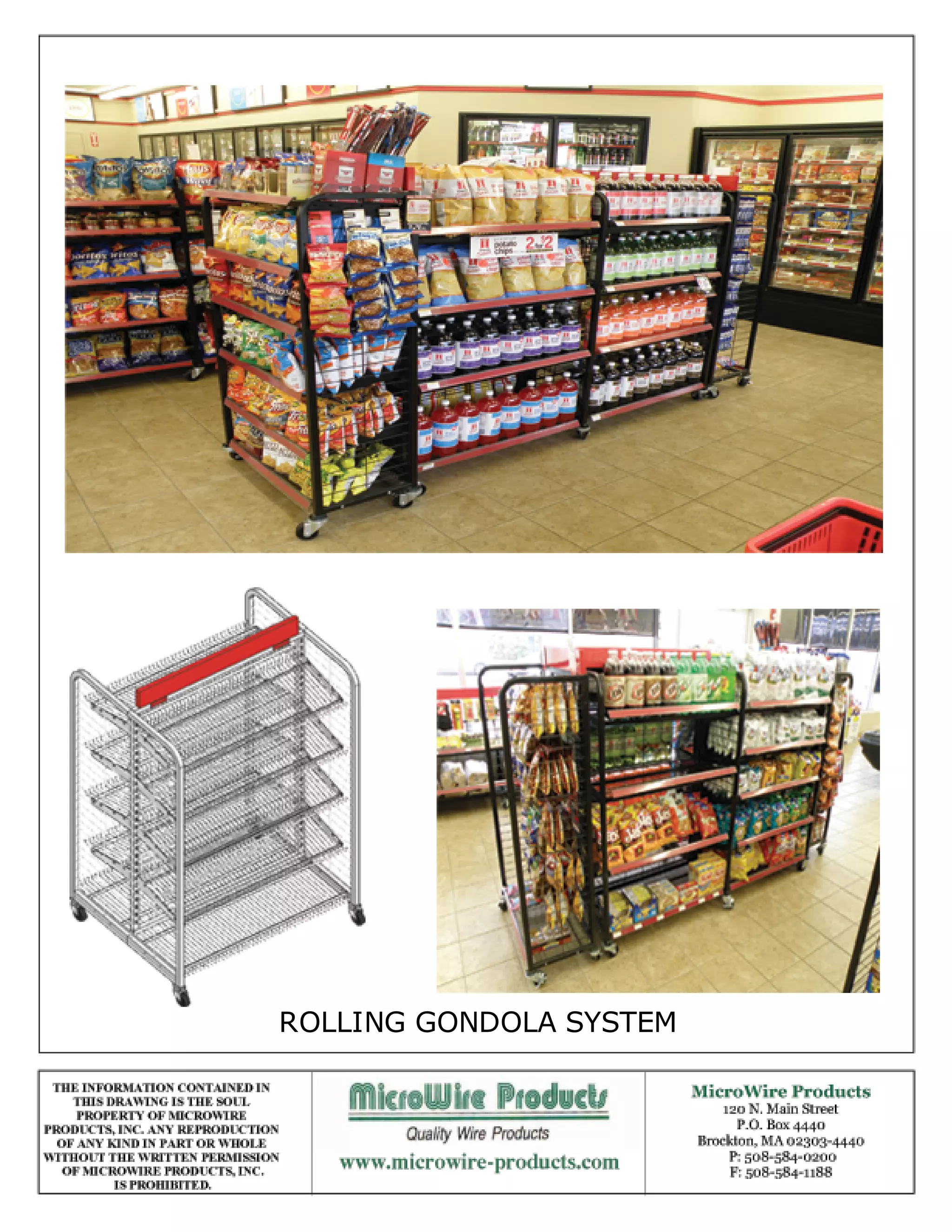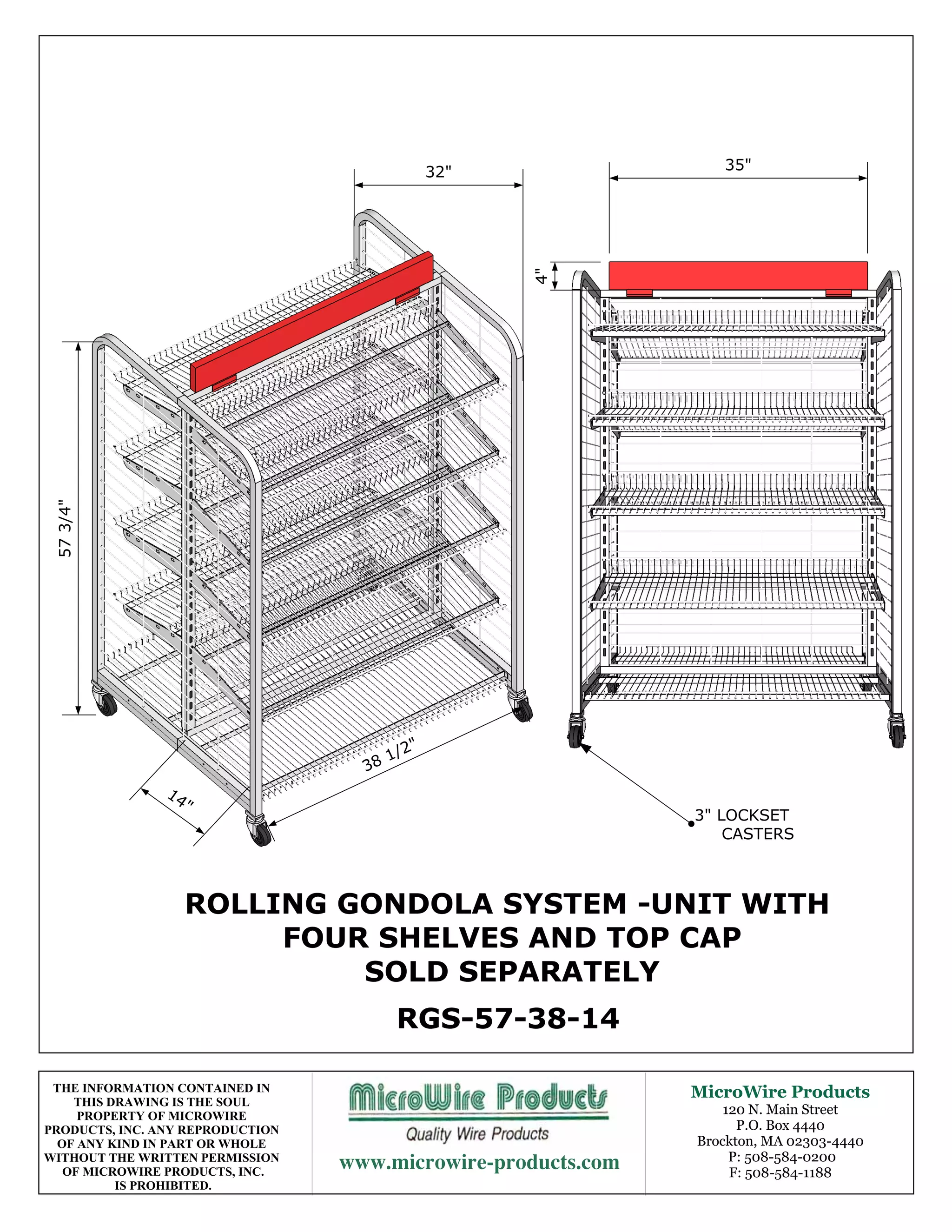 The document contains technical drawings and specifications for components of a rolling gondola system produced by MicroWire Products, including dimensions, materials, part numbers, and a disclaimer stating the information is proprietary property. Key components shown are the base unit, adjustable shelves, top cap, and peg hooks.