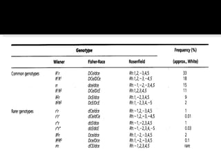 The Rh blood group system involves a complex of antigens encoded by genes at a single locus. There are several terminologies used to describe the Rh system based on proposed genetic mechanisms or presence/absence of antigens. The most widely used terminology describes antigens as products of alleles at the locus (e.g. D, C, E, c, e) and their combinations in haplotypes determine phenotypes. Anti-D is the most immunogenic antibody and causes hemolytic disease of the newborn when a Rh-negative mother is sensitized during pregnancy with a Rh-positive baby. Testing for Rh involves detection of D and other antigens through agglutination assays.