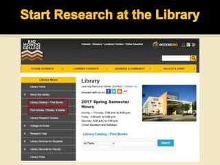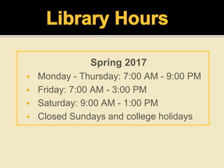 The document provides information about the hours of operation and services available at the Rio Hondo College library. The library is open Monday through Thursday 7 AM to 9 PM, Friday 7 AM to 3 PM, and Saturday 9 AM to 1 PM. It is closed on Sundays and holidays. Services include book checkout at the circulation desk, newspapers and magazines in the periodicals area, reference help from librarians, non-circulating resources at the reference desk, computer lab, printing and copying, study rooms that can be reserved in advance, and a juvenile literature collection.
