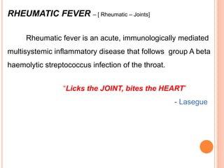 Rheumatic heart disease is a major complication of rheumatic fever, triggered by group A streptococcal throat infections, leading to inflammation of the heart and potential valve damage. It primarily affects children in developing nations and is characterized by symptoms such as carditis, polyarthritis, and chorea, with significant laboratory findings including elevated inflammatory markers and echocardiographic evidence of heart involvement. Long-term effects include severe valvular diseases, particularly affecting the mitral valve, which can result in heart failure and other serious complications.
