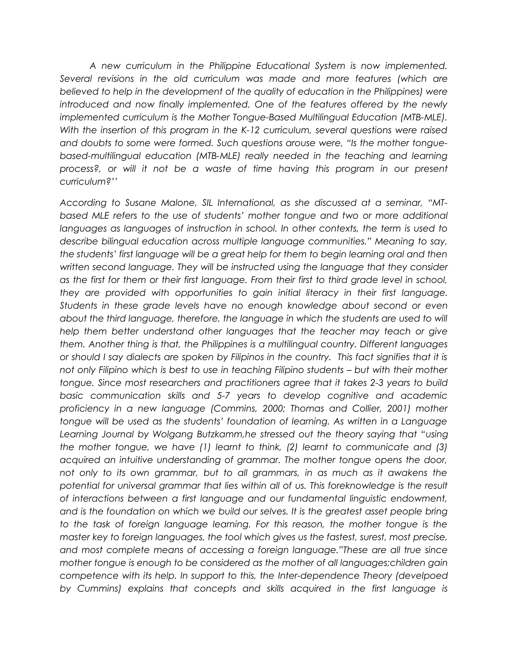 A new curriculum in the Philippine educational system has been implemented, including revisions to the old curriculum and new features aimed at improving education quality. One new feature is the Mother Tongue-Based Multilingual Education program, which allows students to be instructed in their first language. This program raises questions about its benefits. Research shows that using a student's mother tongue helps them learn new languages better and more quickly. It can take years to become proficient in a new language, so starting instruction in the mother tongue provides a stronger foundation for learning. The multilingual nature of the Philippines also supports instructing students in their own first language dialects rather than just in Filipino.