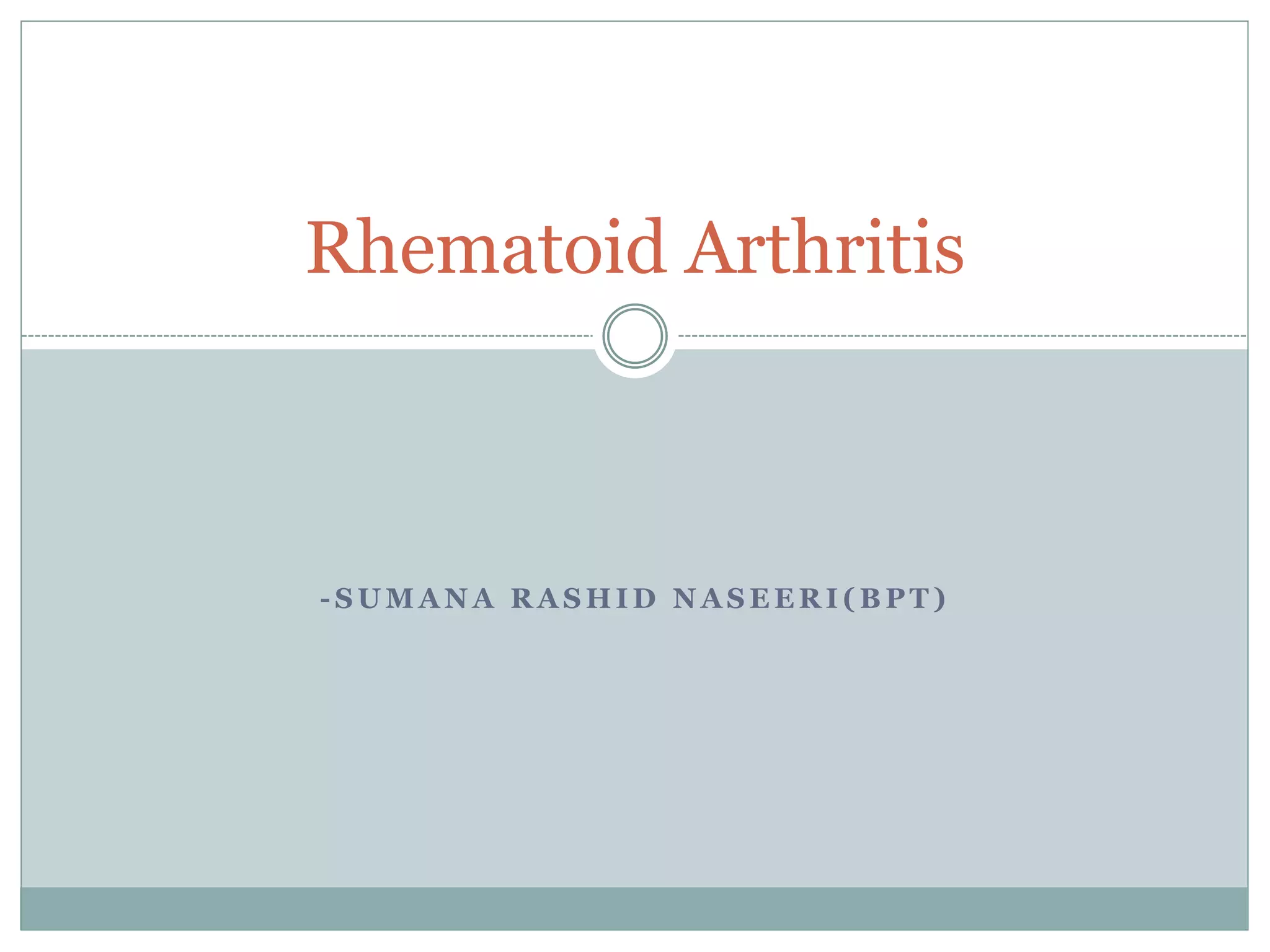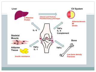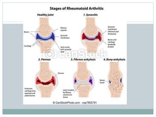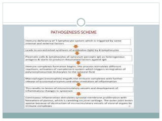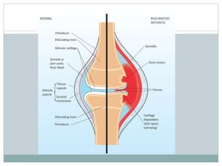 Rheumatoid arthritis is a chronic inflammatory disease that primarily affects the joints, especially small joints in the hands and feet. It is more common in women and is caused by genetic and autoimmune factors. Symptoms include pain, stiffness, swelling in small and large joints. Over time, joint deformities can develop if not treated. Diagnostic tests include blood tests, x-rays, MRI and synovial fluid analysis. Treatment involves medications like NSAIDs, DMARDs, steroids and biologics to reduce inflammation and prevent joint damage. Lifestyle changes and physical therapy can also help manage symptoms. Complications may include osteoporosis, lung and heart disease if not properly treated.