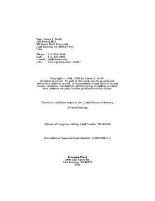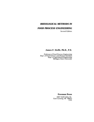 This document provides the table of contents for the book "Rheological Methods in Food Process Engineering" by James F. Steffe. The book covers topics such as stress and strain, fluid and solid behavior, viscometry methods including tube, rotational, and empirical techniques, and applications to foods like sauces, starches, and dairy products. It includes examples and problems related to measuring and modeling the rheological properties of various food materials.