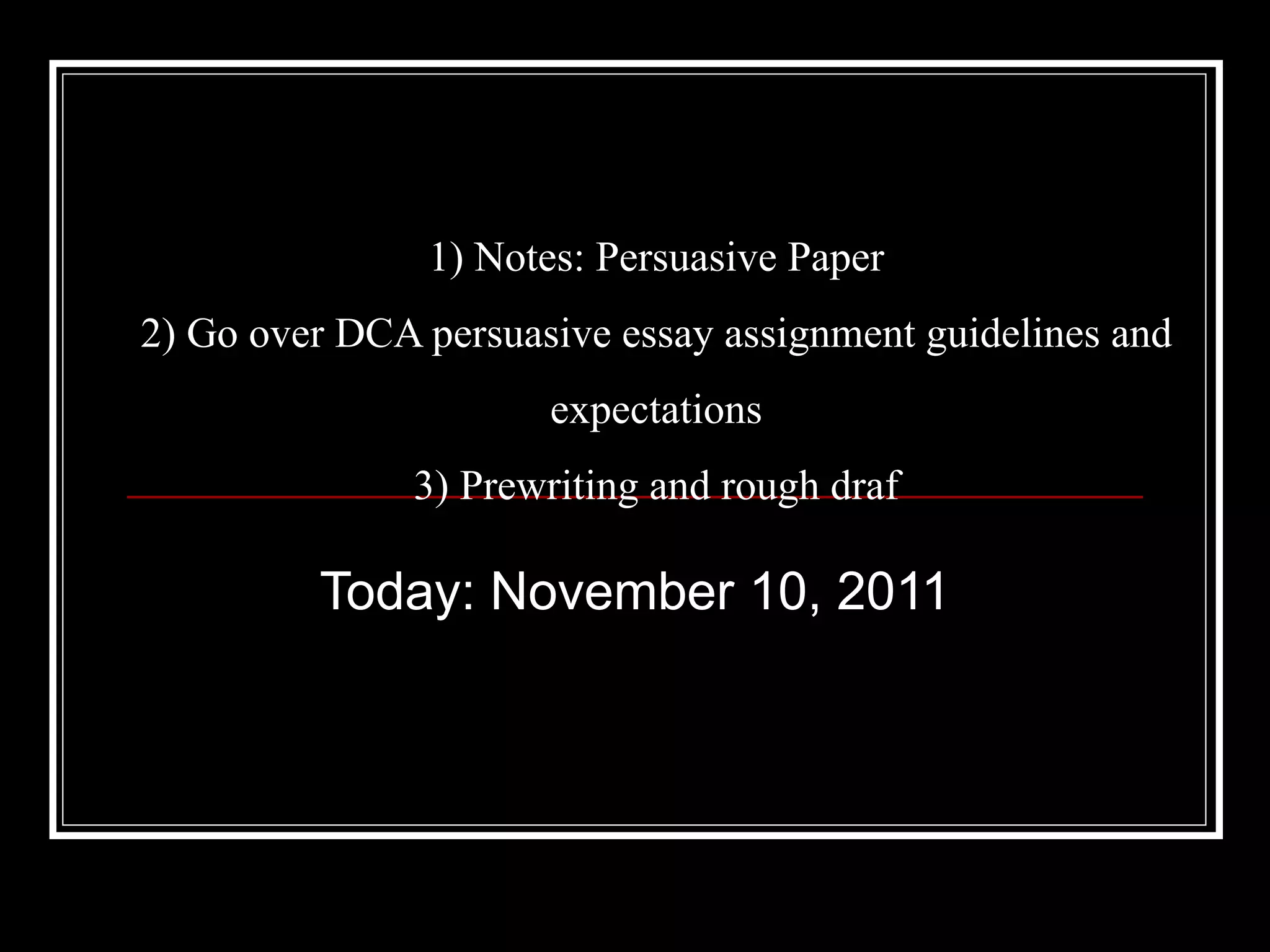 3) Guidelines are provided for an assignment on persuasive writing requiring addressing alternate viewpoints without using first or second person while taking a stand on one side of an issue.