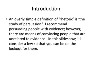 The document discusses various rhetorical devices used in persuasion, including euphemisms, dysphemisms, hedges, and downplayers, explaining how they can influence perception even if they don't provide direct evidence. It further explores methods of insinuation, loaded questions, hyperbole, understatement, proof surrogates, and the use of imagery in communication. The presentation aims to educate the audience on recognizing these techniques to understand and critically analyze persuasive language.