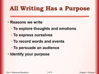 The document discusses the key rhetorical elements to consider when writing, including purpose, audience, genre, stance, and media/design. Specifically, it emphasizes that all writing has a purpose and identifying your purpose, audience, and how best to appeal to and address your audience. It also discusses how genre, stance, choice of media or medium, and design elements should all be selected based on the rhetorical situation.
