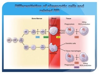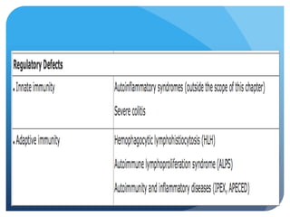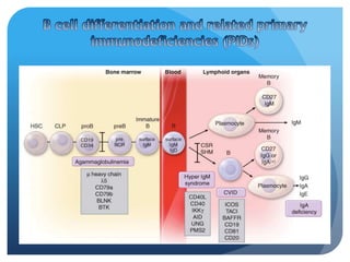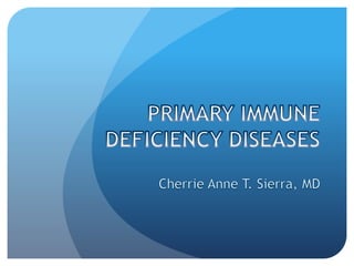 The document discusses primary immunodeficiencies (PIDs), which are genetic disorders caused by defects in the immune system. It describes several key properties of the immune system and outlines deficiencies that can occur in both the innate and adaptive immune systems. Specific PIDs are then discussed in detail, including symptoms, diagnosis, and treatment options. The document emphasizes the importance of early diagnosis and molecular testing to determine the suitable treatment for each PID.