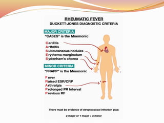 Acute rheumatic fever is an inflammatory disease that can develop following a streptococcal infection such as strep throat or scarlet fever. It primarily affects the heart, joints, brain, and skin. Common symptoms include fever, joint pain, abnormal heart rhythms, involuntary movements, and rashes. It is most common in children ages 5-15. Treatment involves antibiotics to treat the initial infection, medications to reduce inflammation and symptoms, and long-term preventative antibiotics to avoid recurrence. Nursing care focuses on reducing fever, monitoring for cardiac complications, maintaining activity and rest, and educating patients and families.