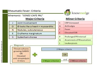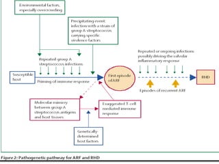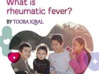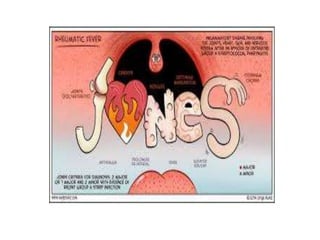Rheumatic fever is an inflammatory disorder that occurs as a result of a prior streptococcal throat infection. It affects connective tissues, especially the heart. The disease most commonly affects children ages 5-15. It is characterized by symptoms like polyarthritis, carditis, chorea, and subcutaneous nodules. Long term complications include rheumatic heart disease, which can lead to problems like heart failure. Treatment involves bed rest, antibiotics to eradicate streptococci, and anti-inflammatory drugs. Recurrences can be prevented with long-term antibiotic prophylaxis.