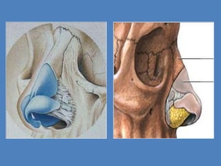 This document discusses the anatomy and assessment of rhinoplasty. It outlines the layers of the nose, including skin, muscle, and cartilage. It divides the nose into three sections - the upper, middle, and lower thirds. It also identifies red flags for patients such as those displaying SIMON traits, which could indicate unrealistic expectations of the procedure's outcome. Assessment involves examining the nose from multiple angles and measuring angles and distances to aid surgical planning.