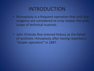 Rhinoplasty is a plastic surgery procedure used to correct and reconstruct the nose. There are two types: reconstructive surgery restores form and function, while cosmetic surgery improves appearance. The rhinoplasty procedure involves anesthesia, incisions to access the nasal structure, reshaping bones and cartilage, correcting deviations, and closing incisions. Post-operative care requires head elevation, medication, limited activity, and avoiding extreme facial expressions. Risks include infection, breathing issues, and an unsatisfactory result.